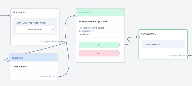 Раньше, чтобы отследить, нажал пользователь на кнопку-ссылку или нет, нам приходилось использовать шаг «Условие», которое проверяло, перешел ли пользователь по ссылке. И чтобы это условие работало, перед ним нужно было ставить «Задержку». Сколько задержку выставили — в течение этого времени «Условие» могло отследить нажатие на ссылку. Неудобно, да.