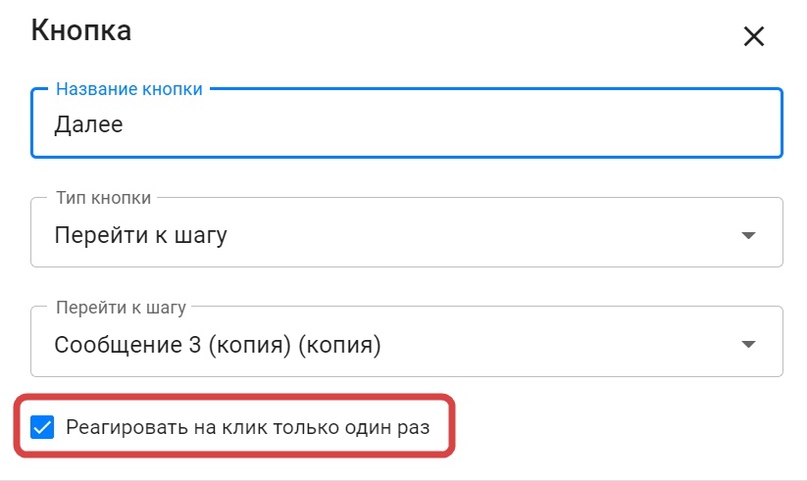 Теперь можно предотвратить повторную реакцию бота на нажатие кнопки. Для этого откройте настройки кнопки и поставьте галочку «Реагировать на клик только один раз», как показано на скриншоте: