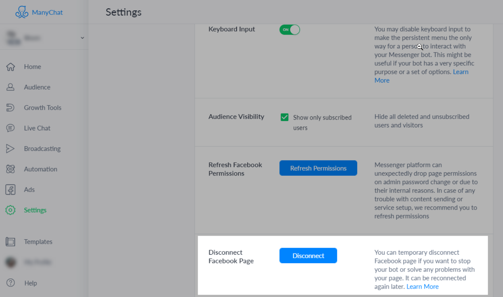 Отключите ботов от сервиса ManyChat. Для этого перейдите в раздел Settings. Откройте вкладку General и напротив опции Disconnect Facebook* Page нажмите Disconnect.
