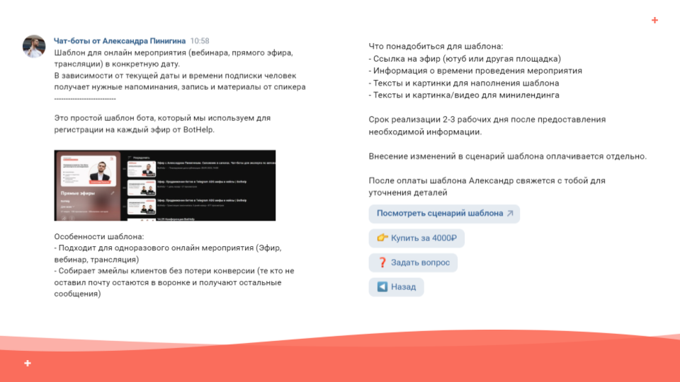 Клиент заходит и видит описание шаблона, для чего он нужен, какие особенности при работе с этим шаблоном, и что нужно для реализации сценария. Тут же сразу стоит ссылка на оплату.