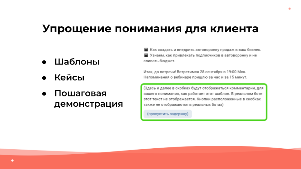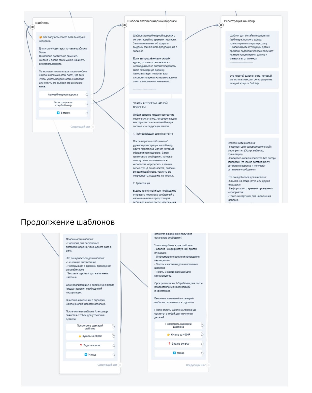 Еще шаблоны могут быть источником идей для клиентов. Когда клиент приходит с какой-то абстрактной задачей, ему достаточно сложно понять что нужно. И если он видит готовый шаблон, то просто изучает его и говорит: «Вот это мне подходит или не подходит» или «Возьмите этот шаблон и добавьте сюда вот такие сообщения».