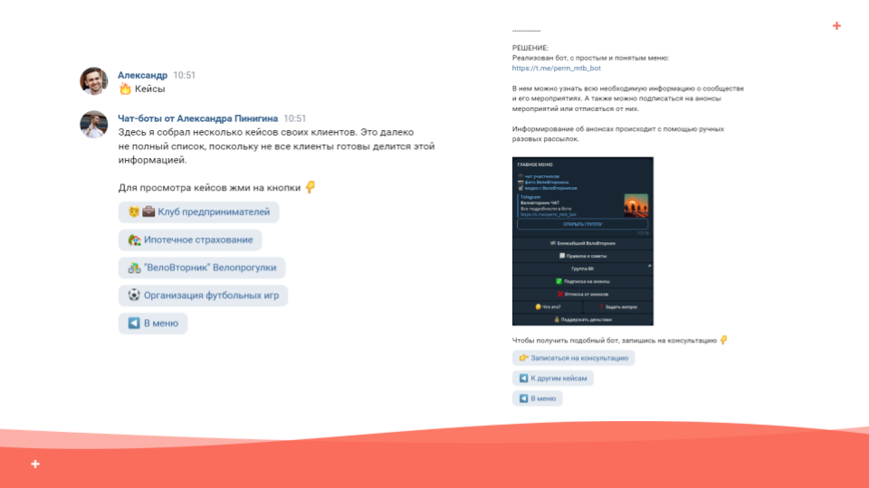 Вы можете продемонстрировать более сложные решения на реальных кейсах. Это поможет клиентам лучше понять ваш потенциал. Увидеть, какие задачи и проблемы вы решили, какие выгоды получил клиент от чат-бота.