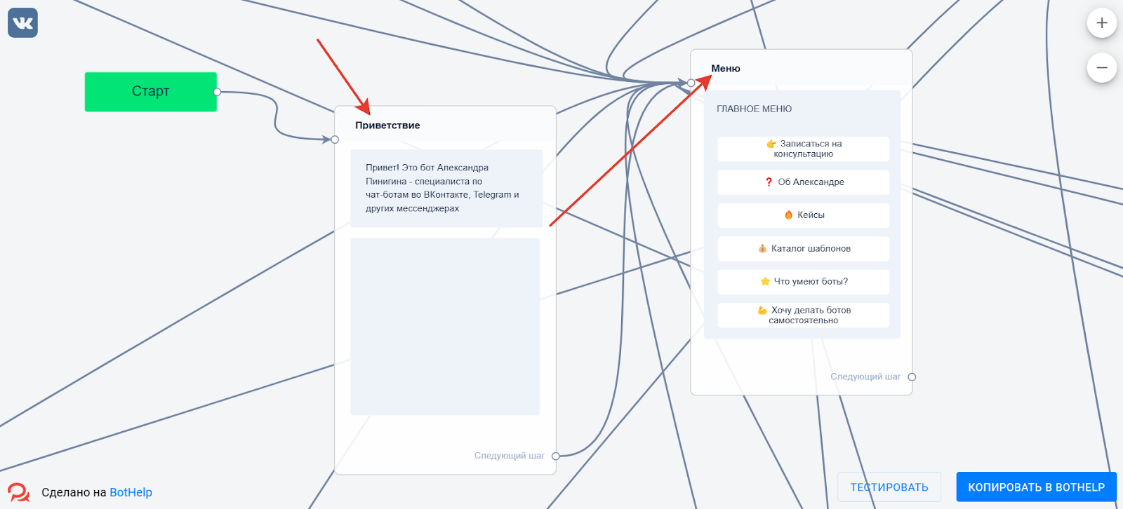 Приветствие. Тут приветственное сообщение, которое приходит только при первом запуске этого бота. Дальше при возвращении в меню из каждого шага подписчику будет отображаться только меню уже без приветствия.
