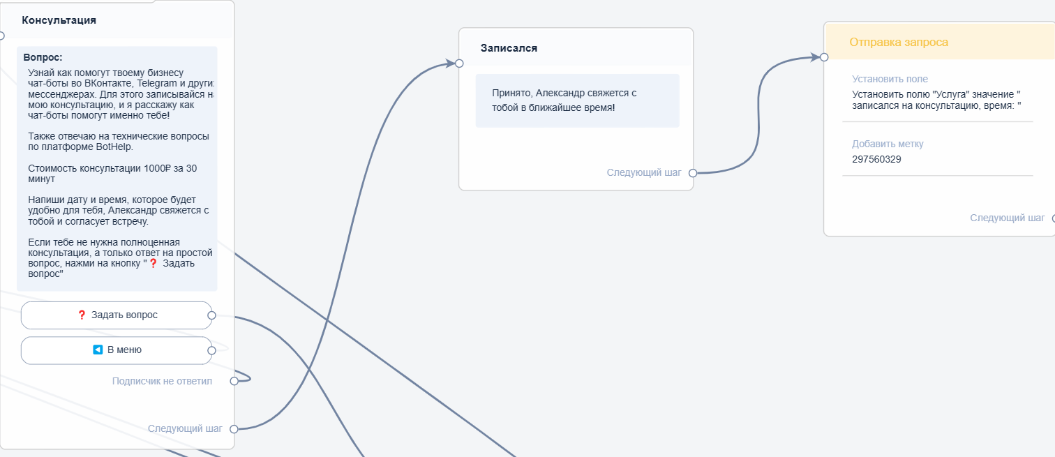 Я получаю сообщение о том, что такой-то клиент записался на консультацию. Дублирую данные о клиенте в Google Таблицу: собираю статистику об этих клиентах, присваиваю метку тем, кто записывался на консультацию.
