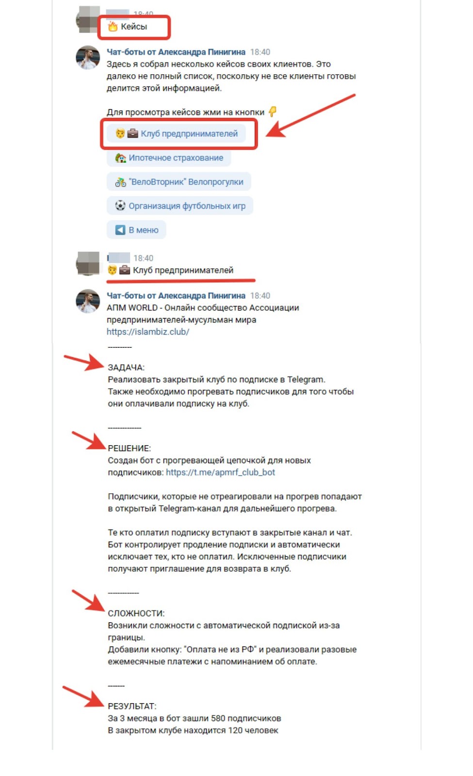 Если у вас есть какой-то результат в цифрах, то обязательно добавляйте его в кейс. В кейсе мы видим, что из 580 человек, которые зашли в бота, 120 сейчас находятся в клубе и ежемесячно его оплачивают.
