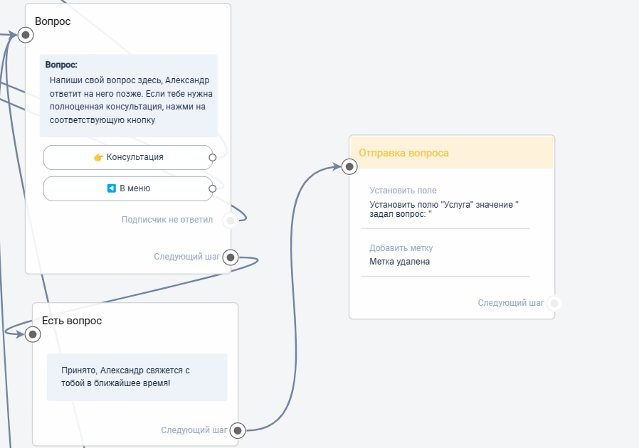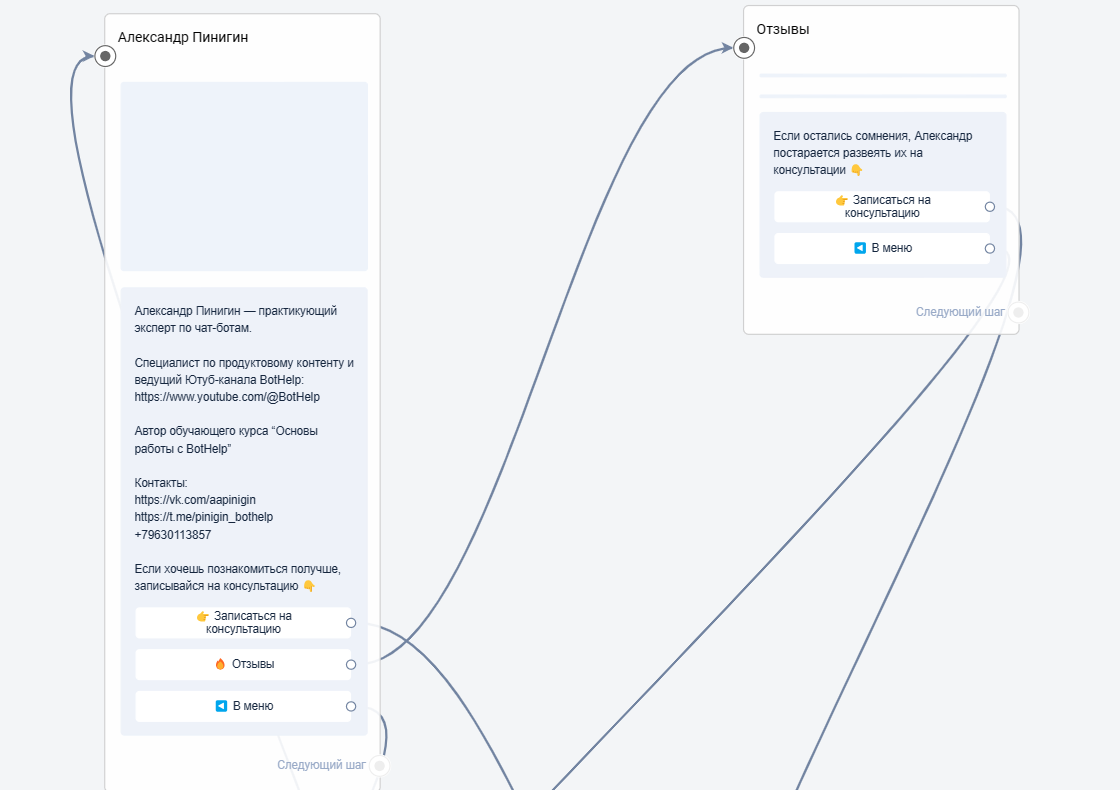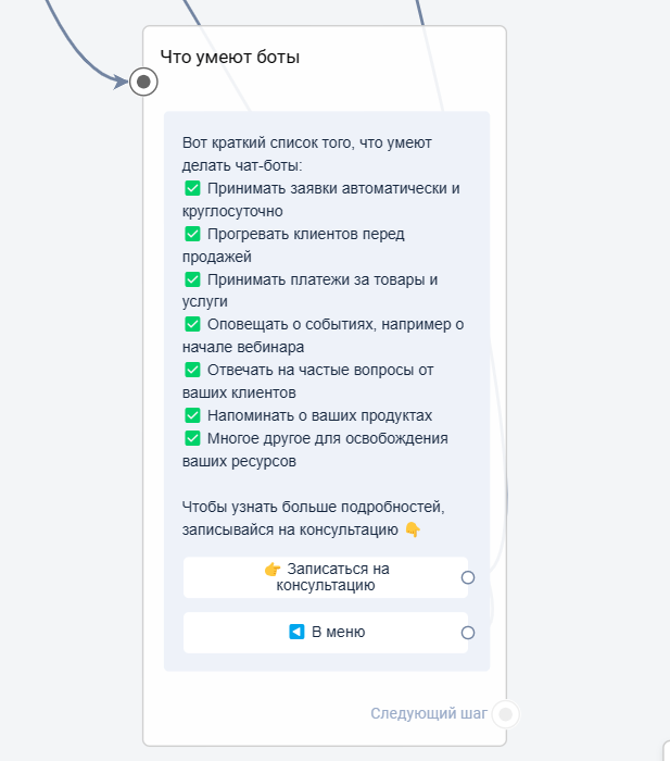 Структурировать коммуникации — могут следовать строго по сценариям и шаблонам коммуникации, это обеспечивает системность взаимодействия с клиентами. Особенно полезны боты, когда эксперт проводит консультации или собирает данные о клиентах.