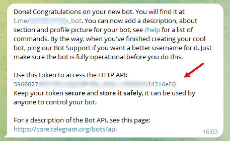 В ответ BotFather пришлёт токен вашего бота. Никому его не показывайте и сохраните в текстовом файле. Токен понадобится, чтобы подключить бота к BotHelp.
