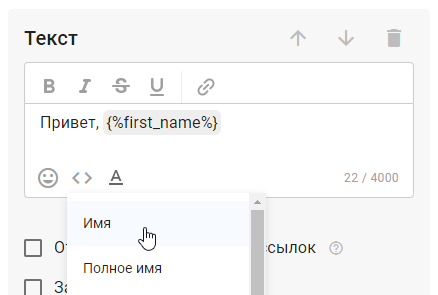 Для того чтобы ваше сообщение было более персонализированным, обратитесь к подписчику по имени. Для этого используйте макрос — это особая строка внутри текстового блока, которая во время отправки заменяется необходимыми данными. Эти данные берутся из профиля подписчика или из других источников внутри платформы.