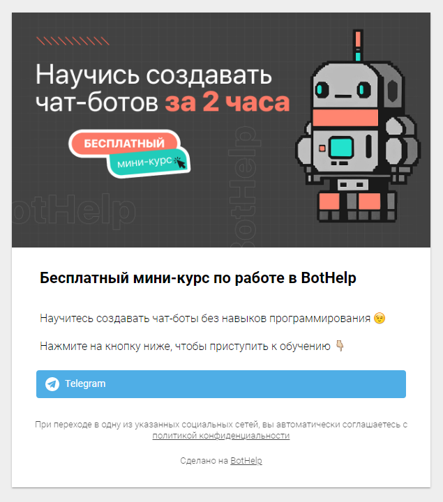 Чтобы узнать ещё больше о создании чат-ботов, пройдите наш бесплатный мини-курс. Жмите на кнопку. Доступ сразу.