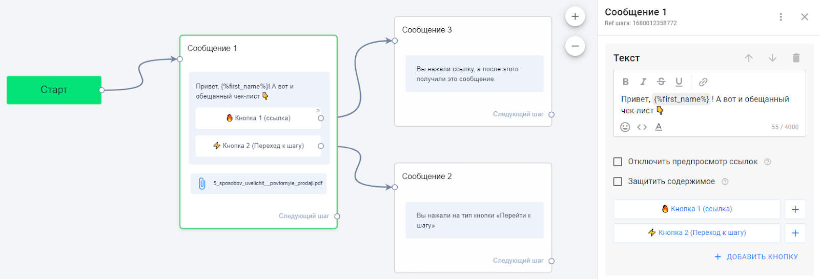 - Перейти к шагу — нажав на неё, пользователь перейдёт на тот шаг в боте, который вы укажете.
