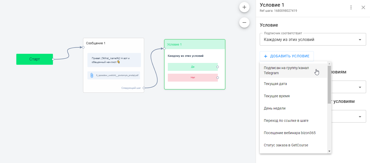 Условия позволяют добавить вариативность в вашу цепочку. При помощи условий вы можете создать несколько вариантов развития событий.