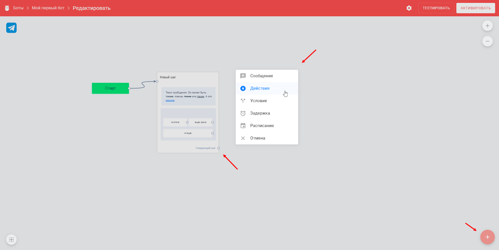 Но это только крохотная часть того, чему можно научить бота. Давайте посмотрим, какие ещё возможности есть в редакторе.