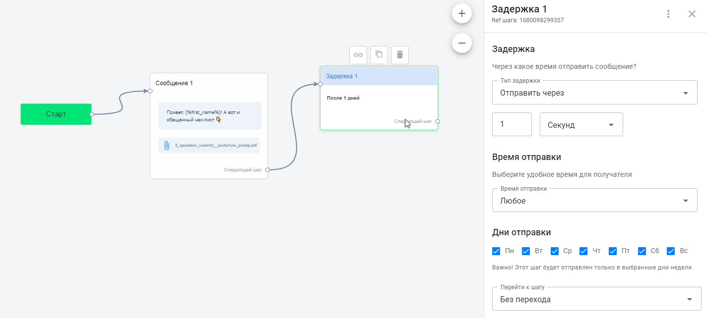 Как и шаги «Действия», шаги «Задержка» не видны пользователям, как текстовые сообщения. Они нужны для внутренней настройки цепочки. Этот блок позволяет отправить следующее сообщение через N секунд, минут, часов или дней.