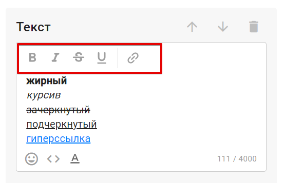 В BotHelp для Telegram доступно форматирование текста: жирный, курсив, подчёркнутый, зачёркнутый, ссылка. Можете выделить важные пункты или ключевые мысли, чтобы обратить на них внимание подписчиков.