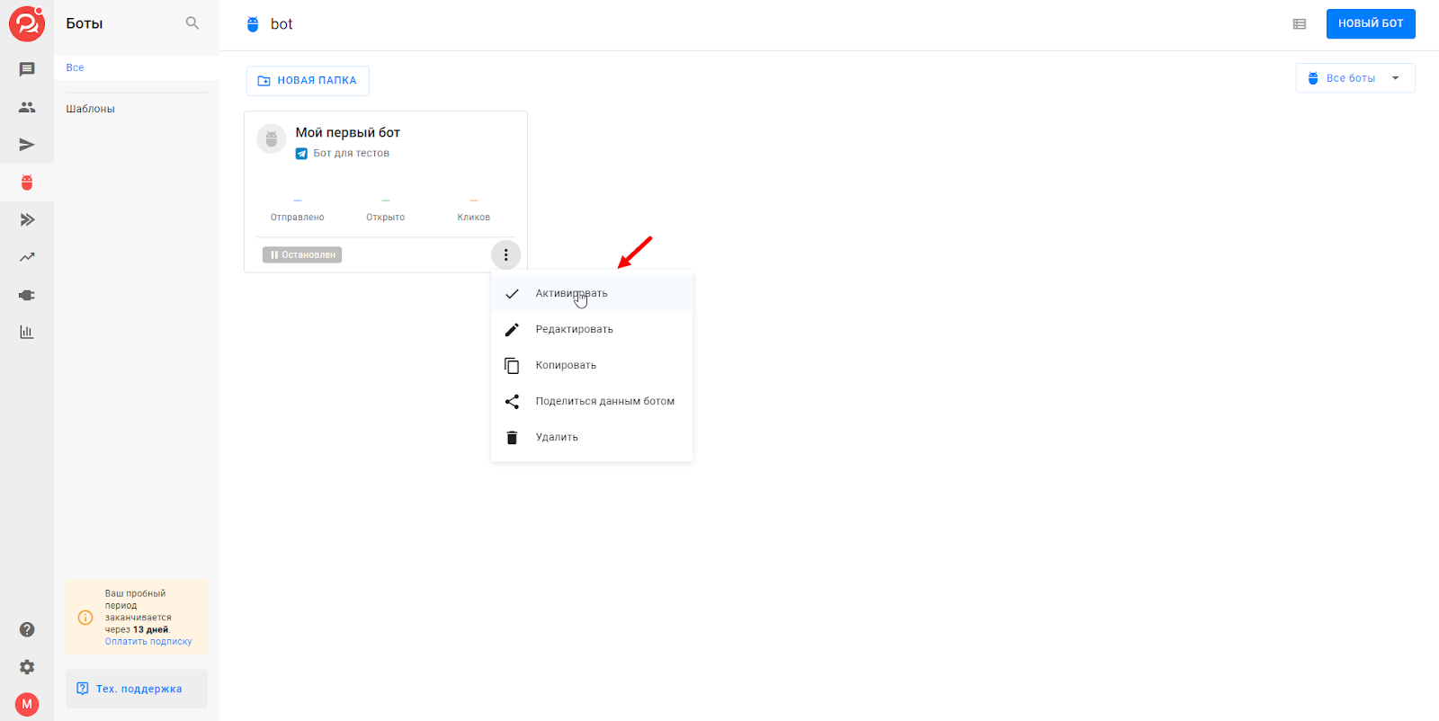 Выйдите из редактора, нажав на «Боты» слева сверху → нажмите на три точки на карточке бота, которого нужно активировать → «Активировать».