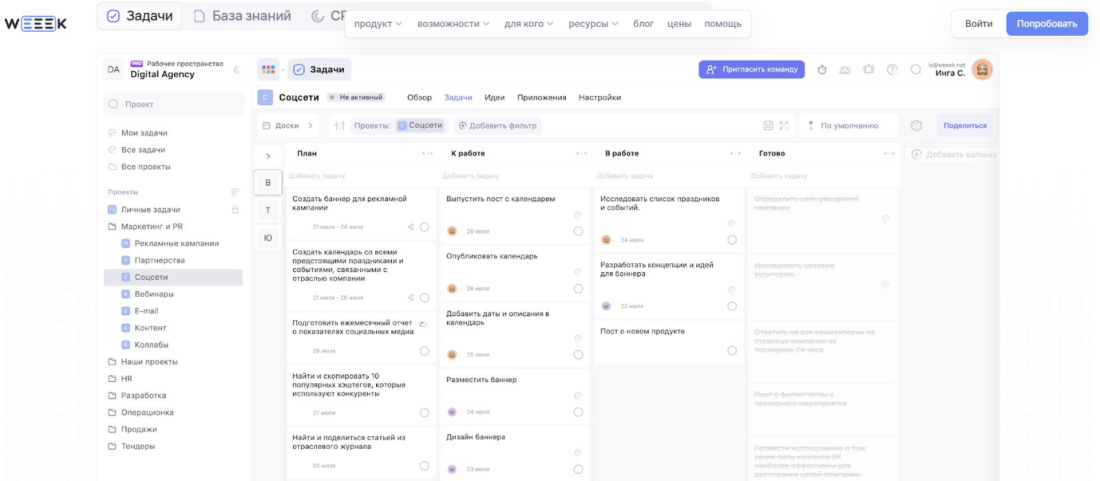 WEEEK — таск-менеджер для управления проектами. В сервисе собраны задачи, проекты, канбан-доски, календари, календарный график гант, напоминания и уведомления в Телеграме.