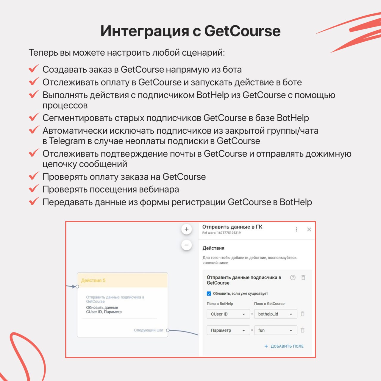 Еще одно преимущество GetCourse, что у платформы есть расширенная интеграция с BotHelp. Вы можете автоматизировать множество процессов. Подробнее об интеграции в нашей базе знаний.