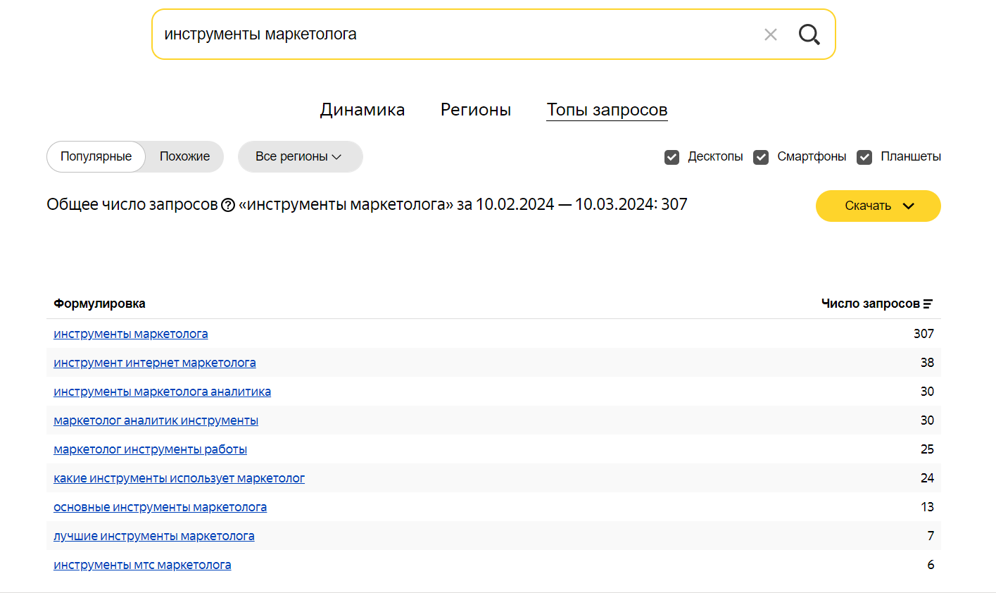 Яндекс Вордстат — инструмент для анализа поисковых запросов. Сервис помогает маркетологам увидеть, какие запросы пользователи вводят в Яндекс, проанализировать их и понять потребности и интересы целевой аудитории, увидеть сезонность продукта, подобрать ключевые слова для продвижения сайта и т. д.