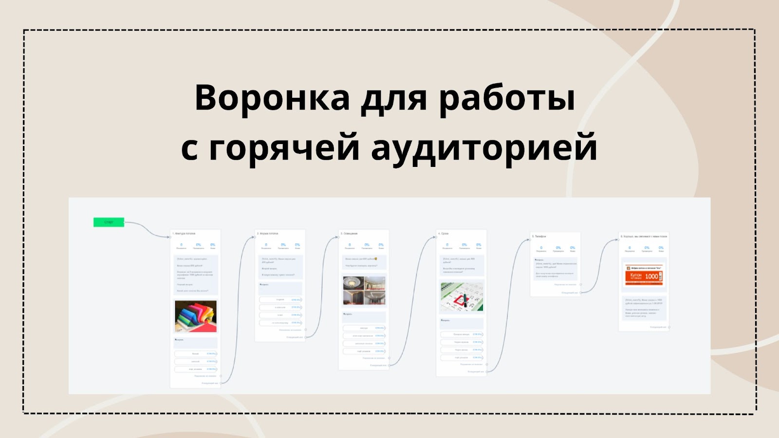 Самый яркий пример — разделение аудитории по теплоте трафика. Например, при работе с горячей аудиторией схема может быть максимально короткой.