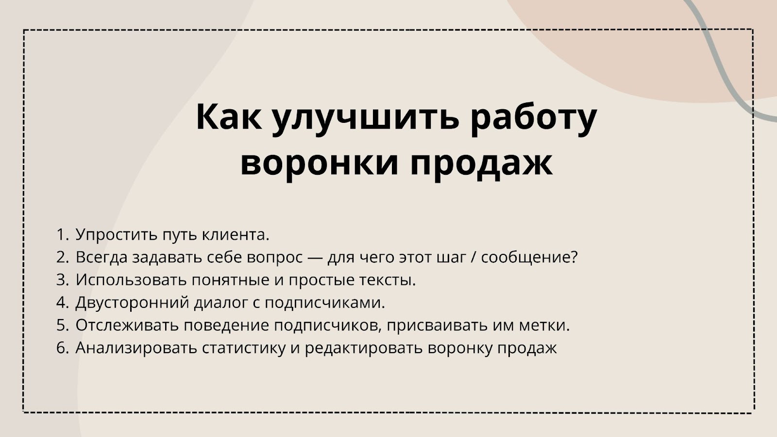 Тестируйте разные подходы. Даже, когда кажется, что воронка работает хорошо и приносит вам продажи. Попробуйте поменять 1–2 сообщения. Меняйте воронку по чуть-чуть, чтобы можно было понять, как меняется результат.