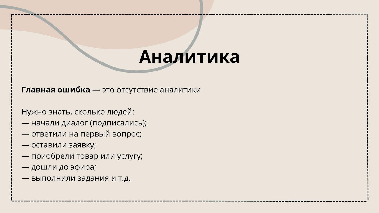 Потому что может оказаться, что воронка рабочая, и нужно переписать какой-то один текст или поменять местами сообщения. Все заработает и будет приносить продажи. Но пока нет аналитики, вы об этом никак не узнаете.
