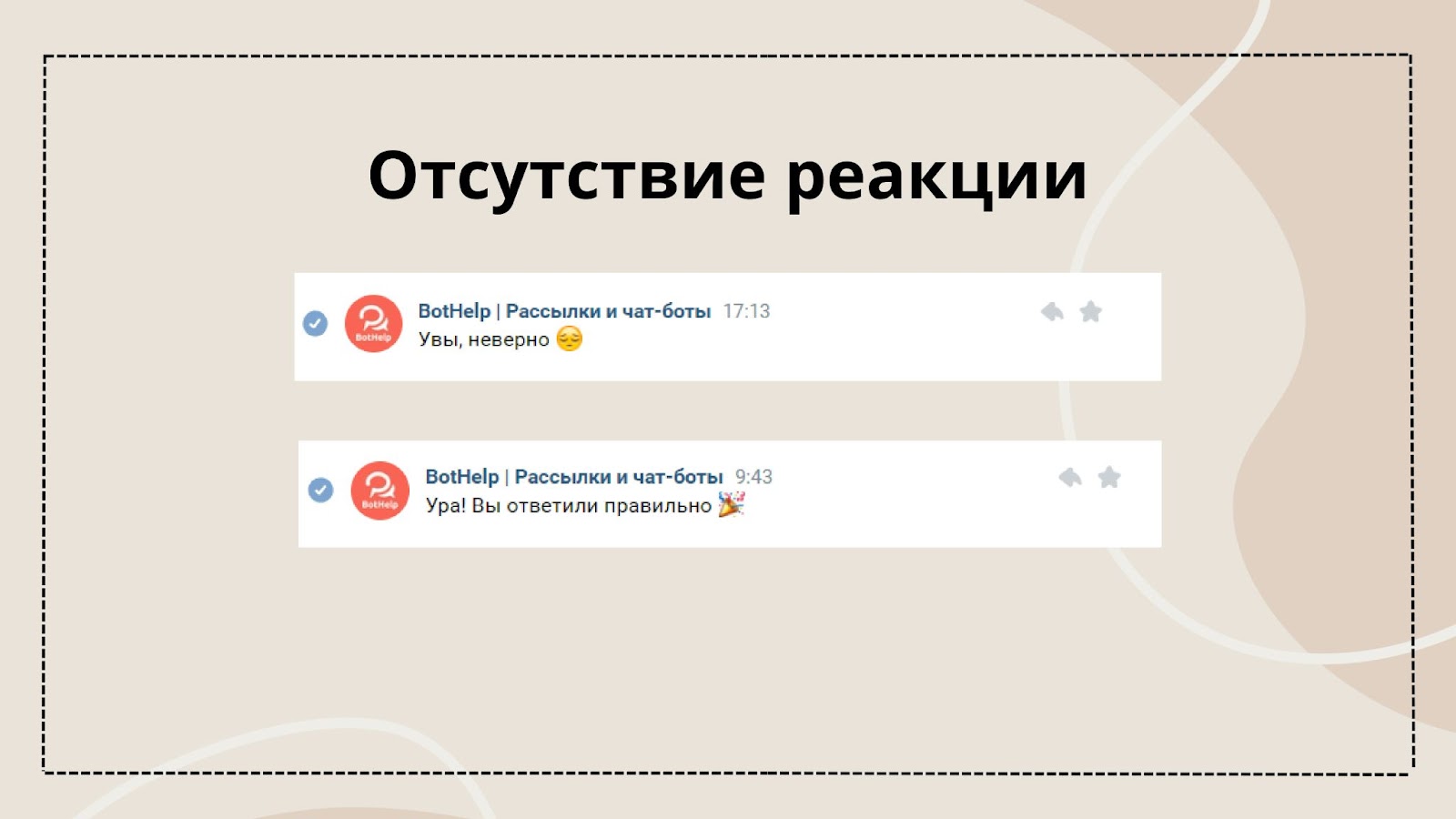 Если подписчик несколько раз отвечает неправильно, а в ответ — тишина, то он подумает, что что-то делает не так или просто расстроится, не завершит тест и уйдет из воронки.