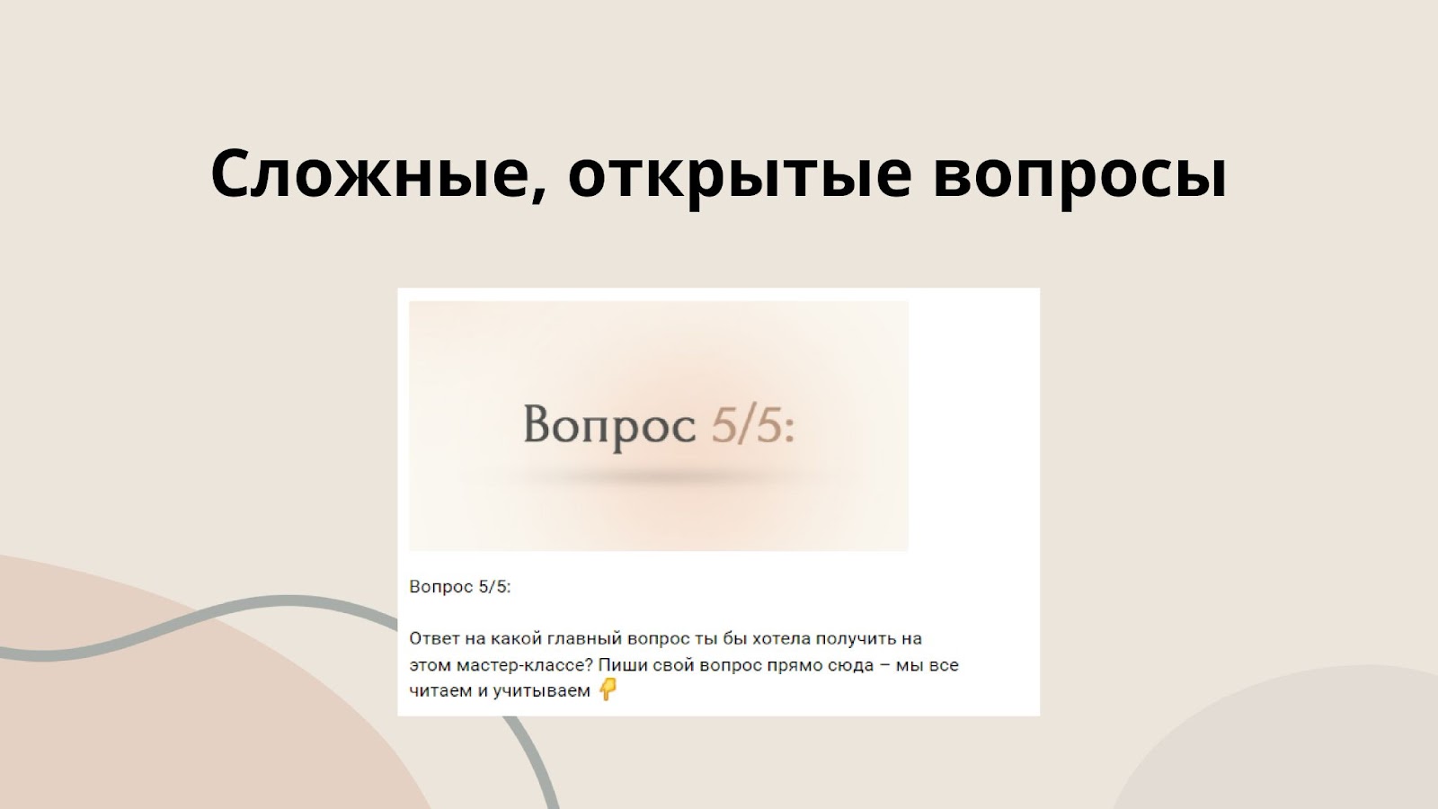 Сложные открытые вопросы. Например, на скриншоте выше вопрос: «На какой вопрос ты бы хотела получить ответ?» Когда человек только зарегистрировался на мастер-класс, он еще может не знать, какие у него есть вопросы к этому мастер-классу. Не понимает, как сформулировать вопрос, что можно спрашивать.