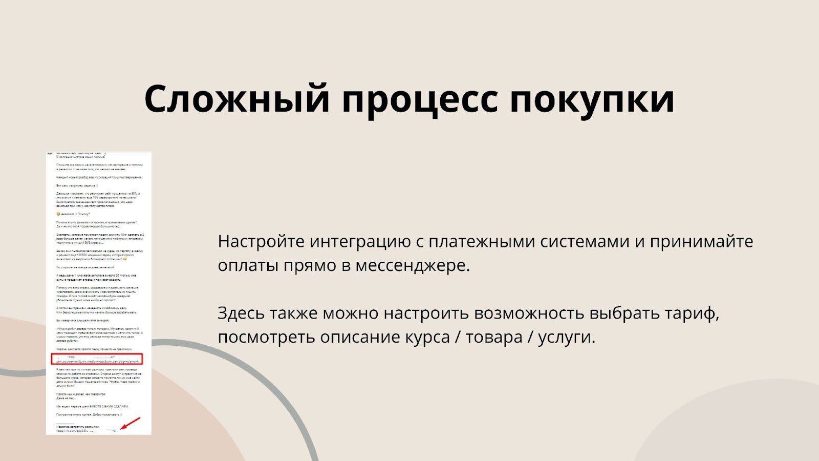 Поэтому лучше настроить интеграцию с платежными системами и принимать оплаты прямо в мессенджере. С помощью чат-ботов настроить возможность выбрать тариф, посмотреть описание курсов, товаров или услуг. Человек не уйдет, а вы будете получать больше продаж.