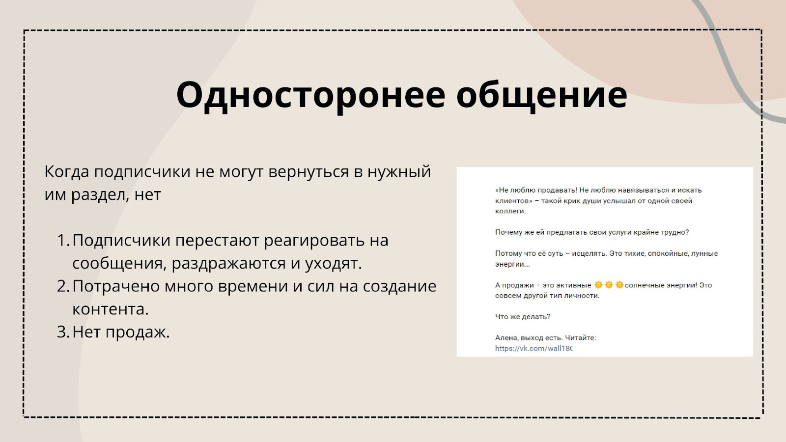 Текст без цели. Когда пишете и сами не можете сказать, для чего это сообщение, что должен сделать в итоге подписчик. Или пытаетесь в одно сообщение сразу добавить несколько мыслей, попросить подписчика сделать сразу три действия.