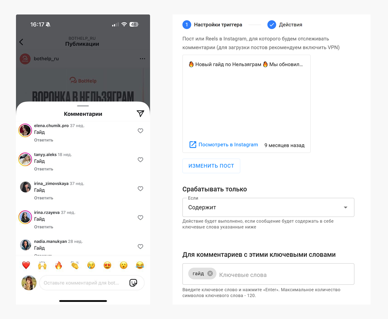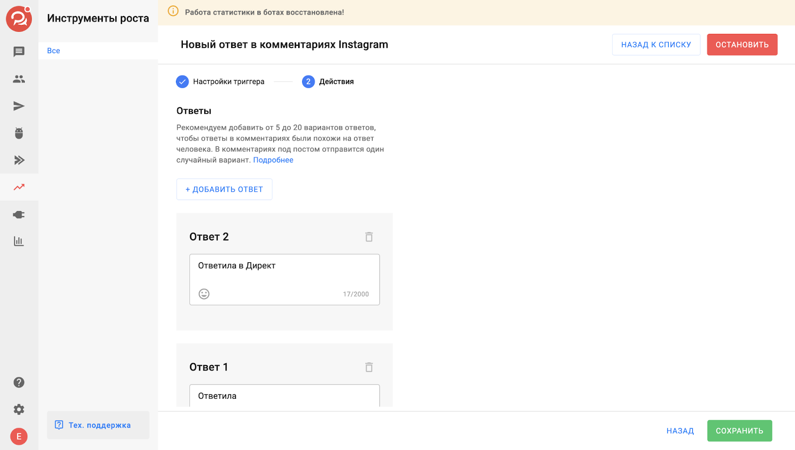 Этот инструмент позволяет автоматически отвечать на комментарий под постами и рилс в аккаунте Instagram*. В BotHelp можно добавить до 20 вариантов ответов на комментарий. Ответы будут отправляться пользователям в случайной последовательности.