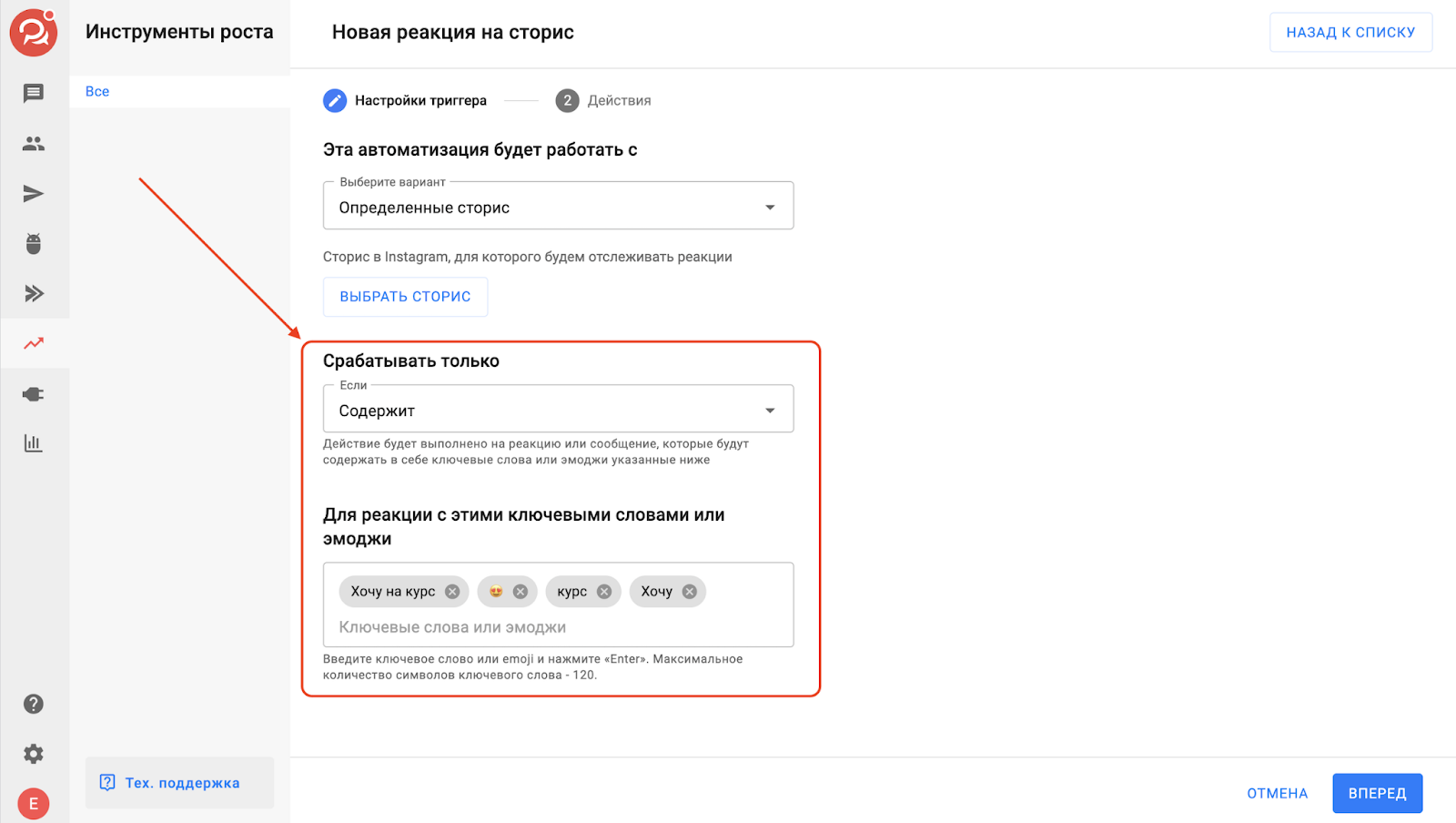 Инструмент позволит запускать бота и другие действия с подписчиками, которые отреагировали на опубликованные сторис.