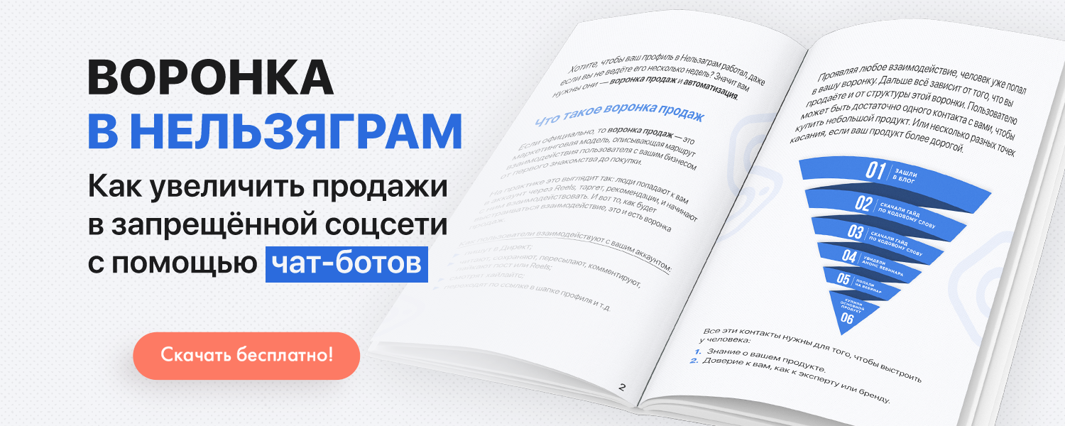 Как, несмотря ни на что, получать продажи в Instagram*. Используйте автоматизацию и воронки продаж. А чтобы проще было начать и точно всё сделать правильно, скачайте наш гайд «Воронка в Инстаграм*. Как увеличить продажи в запрещённой соцсети с помощью чат-ботов».