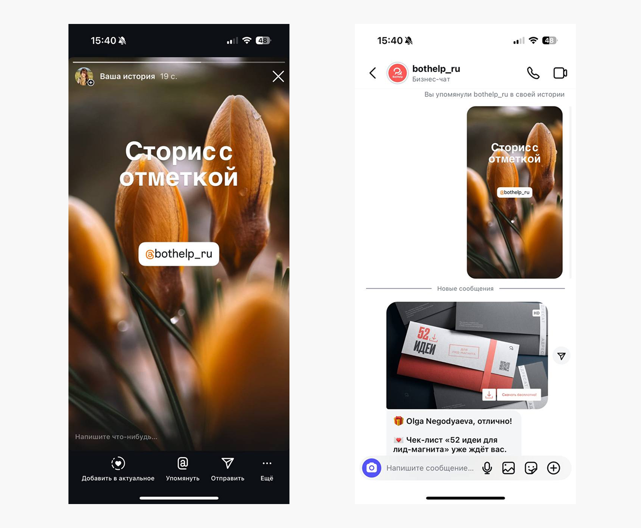 В BotHelp вы можете настроить автоматическую реакцию на упоминание в сторис. При такой настройке подписчику, который отметит вас в сторис, в директ автоматически придёт сообщение и запустится цепочка бота (если опция включена).