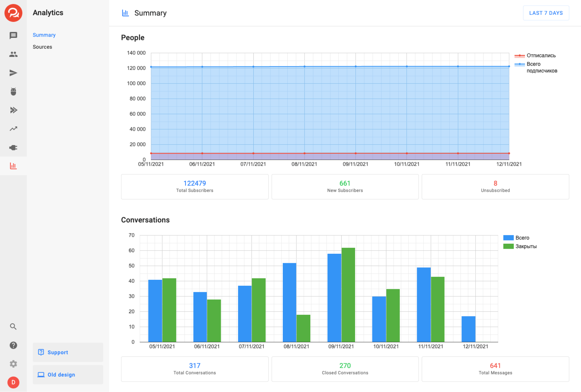 Отслеживайте рост базы подписчиков и отписки по разным каналам. Анализируйте эффективность рекламных каналов при помощи сквозной аналитики в мессенджерах.